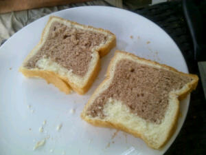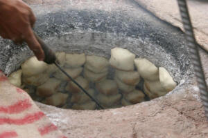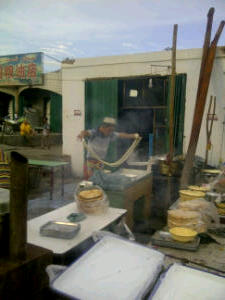 Wonderbaarlijk en niet verwacht maar we eten nog steeds brood! In allerlei varianten nog steeds te koop! Uiteraard geen grof volkoren, waldkorn of zonnenpitten, maar wel altijd heerlijk vers gebakken en de eerste dag erg lekker, daarna is het hopeloos en meestal keihard. Het is vaak Turks, nan-brood, de bakker zit op of rond zn oven en plakt het brood tegen de zijwand, bakt t en haalt het er met een schepje weer af. Dan wordt t door zn echtgenote (?) verkocht voor 1 yuan, dat is 10 eurocent. Op de foto boven zien we. samsa’s, wij noemen het worstenbroodjes! Op de foto onder zie je hoe we ons nog regelmatig vergissen wanneer we denken een Hollands wit brood te hebben gekocht!