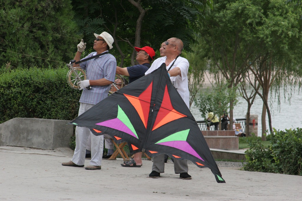 Korla had ongeveer 400.000 inwoners, een aanzienlijk groter dorp! Het is een moderne, rijke industriestad (olie en zware industrie). Hier hebben we langs de rivier gewandeld en zagen we het vermaak van de chinezen, vliegeren en muziek maken :