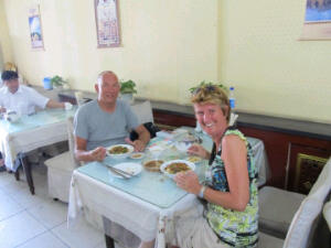 Ongelofelijk hoe snel t went! Op dag 1 loop ik al met een tandenstoker tussen mn tanden, toeter op de weg, en oefen de spuugmethodes! Even wennen aan de vieze vloeren, bellende mannen op t damestoilet, waar je gehurkt zit te plassen, met een dun plastic tussenschotje. Verder vieze plakkerige tafeltjes, maar gelukkg nieuwe houten stokjes om mee te eten en..heerlijk eten! Niet te diep over nadenken maar! Vandaag hebben we eerst samen lekker uit geluncht, daarna in een internetcafé geskypt en een biertje gedronken, toen boodschappen gedaan, brood, meloen, perzikken, bananen, water, afwasmiddel, chips, bier en nootjes, en onze dagbesteding van 10 euro was nog niet op!! Dat is toch ook heerlijk!