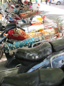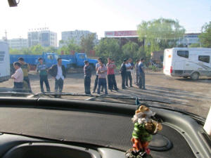 Hoezo zijn Chinezen nieuwsgierig! Bij deze foto rijden we weg van onze overnachtingsplaats, en worden we door een hele club mannen bekeken! Wanneer we ergens aankomen zitten er binnen een mum van tijd zo’n 20 Heren gehurkt in een kringetje bij de campers. Enkelen durven en staan snel aan je deur en als je niet uitkijkt bij je binnen! Het is wel grappig, ze snappen er niks van wat er allemaal in zo’n camper zit! Een toilet? Douche? Maar mn het 3-pits gasfornuisje oogt bewondering! Kan ook niet anders als je bedenkt dat ze hier meestal op 1 gaspit koken! Wanneer we door de stad rijden of lopen kijkt iedereen eens ons na, niet een beetje nee helemaal omgekeerd op hun fiets, scooter of in hun auto! Gister liepen Herman en ik over de bazaar, draaiden ons even om met al die ogen in de rug, we maakten een buiging en kregen spontaan applaus! Ha ha!