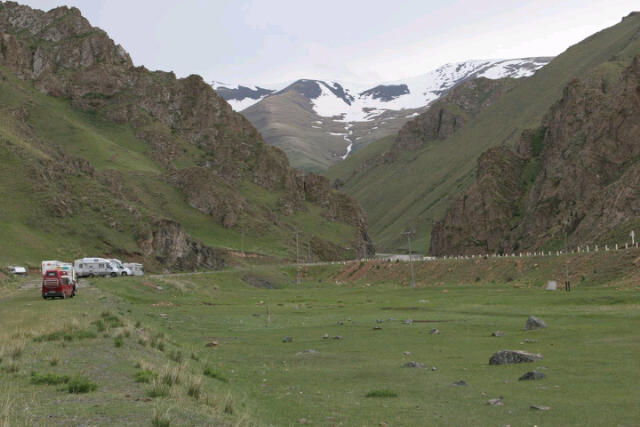 Vannacht hebben we op 2700 Meter overnacht aan een beekje, tussen de grazende paarden. We voelen ons als nomaden! Over de weg komt een vrouw te paard voorbij en kijkt naar al die campers.