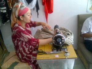 Een tapijtje als tentbekleding voor je yurt daar kijken we niet van op. Tapijtjes als zitting voor je scooter, slim met die zon hier! Een tapijtje als vuilnisbelt, waar je lekker al je troep onder kunt gooien hebben we in Uzbekistan leren kennen, de hoogte was aanzienlijk hoger toen we gingen dan toen we kwamen! Een tapijtje als voetsteuntje op je trapnaaimachine ook lekker, maakt t wat egaler toch? Tapijtjes zagen we ook op de dierenmarkt zondag, in de bakkies achter de scooters, waar de schapen en dë geiten in zaten! Vandaag kwam ik dit schaap tegen, dat ook nog een tapijtje mocht voelen..
