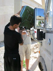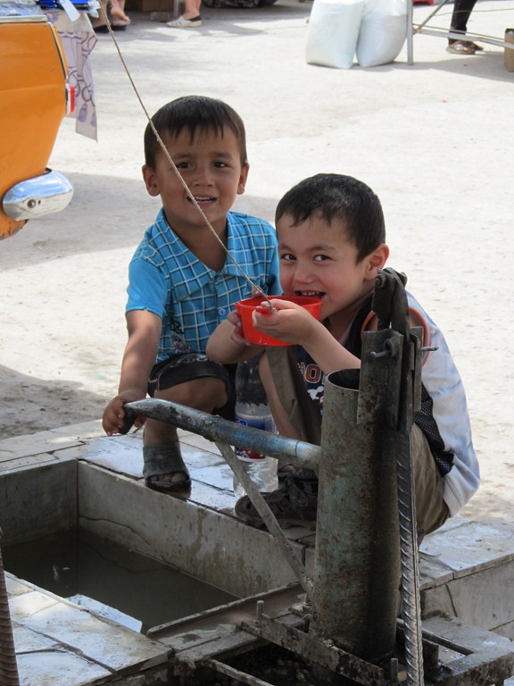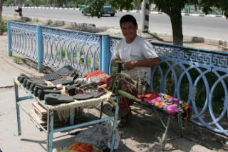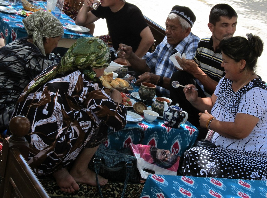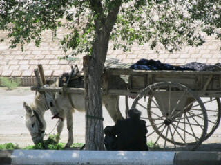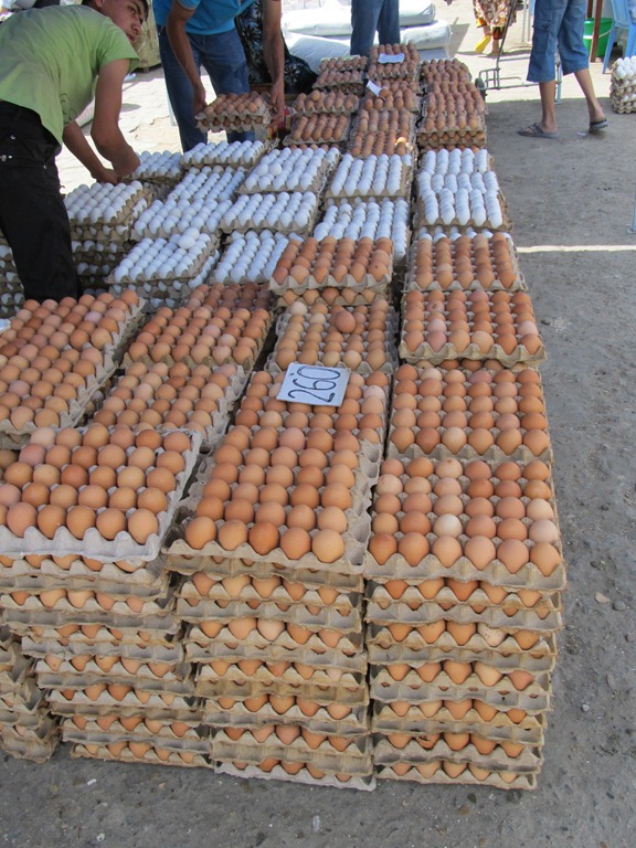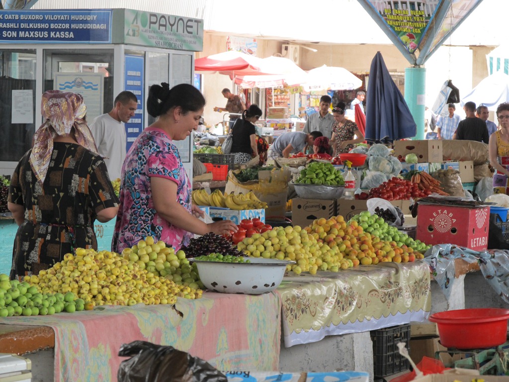 Van grens naar grens trekkend heeft ook tot gevolg dat wij onze grenzen grenzeloos verleggen. We gaan niet alleen naar de bazaar om tomaten en komkommers annex augurken, in ieder geval groen met een velletje, te kopen. Maar hebben daar tevens ons grenswisselkantoor. We worden aangesproken, geven een 100€ Biljet af , en uit een zwarte plastic zak komen de flappen in grote getale! Het kan ook in een tapijtenzaak, dan worden we achter een kleedje getrokken en komt er geld uit de kussensloop! Ons biljet gaat niet door een automaat, nee wordt een keer rondgedraaid en goedgekeurd. We hoeven niet naar een loketje, geen pincode te onthouden, geen handtekening te zetten, nee gewoon kassa! Iedereen doet t zo, politie keurt het oogluikend toe, en de koers is 50% hoger! Een gek die het niet doet toch? Ook de diesel in Uzbekistan is een verhaal apart, niet zoveel te krijgen hier want de meeste auto’s lopen op benzine. De eerste avond zagen we buschauffeurs met jerrycans de meegenomen diesel overgieten in hun tank! Beetje raar dachten we! De volgende dag stonden we zelf op de boerderij en werd onze tank met een jerrycan door een 12 Jarig jongetje gevuld! Keurig gezeefd door een pantykousje! Geen wonder dat hier zoveel ezeltjes zijn, die lopen gewoon op gras!