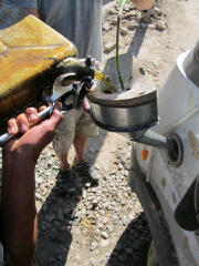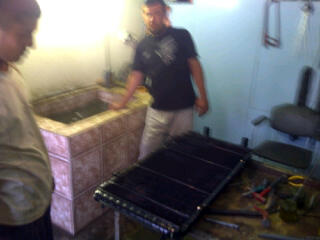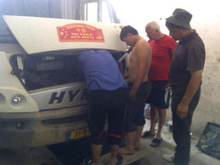 Nadat we aangekomen waren in Buchara, leek er een plas water onder onze camper te liggen, maar volgens de deskundigheid van Se, opgedaan in een vorig leven, was het koelvloeistof. Er zat een gat in de radiator, waarschijnlijk steenslag, zou zo maar kunnen op deze wegen. Dus op zoek naar een garage, mbv onze lokale gids Sacha (hm een beschuitje..).Herman ïs er met ons huis naartoe gereden. Deze ‘garage’ bestond uit 15 verschillende boxen met ieder een eigen specialiteit! Dus in box 3 de uitbouw van de radiator, toen met de radiator onder de arm naar box 14, waar het laswerk plaats vond en daarna weer naar box 3 voor de inbouw van de geerpareerde radiator, maar helaas lunchtijd! Na 5 uur werk door 3 personen, 27 euro armer!, zat de boel weer in elkaar! We kunnen weer verder gelukkig! En weer een ervaring rijker! De fotos zijn helaas een beetje wazig, maar een indruk krijg je wel! Ps het is hier 40 graden. Tip van de dag, cool down!
