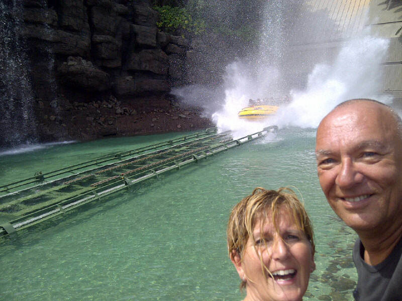 Daar droog gebleven, 3 roltrappen naar low level om alsnog een nat pak te halen bij Jurassic Park.