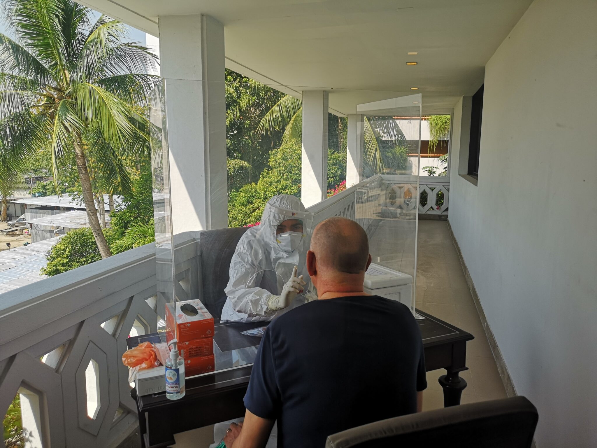 Twee maal daags worden we getempt aan de deur, door een volledig ingepakte en geüniformeerde “nurse”. Bij een temperatuur van 37.5 word je ingestuurd naar het ziekenhuis.