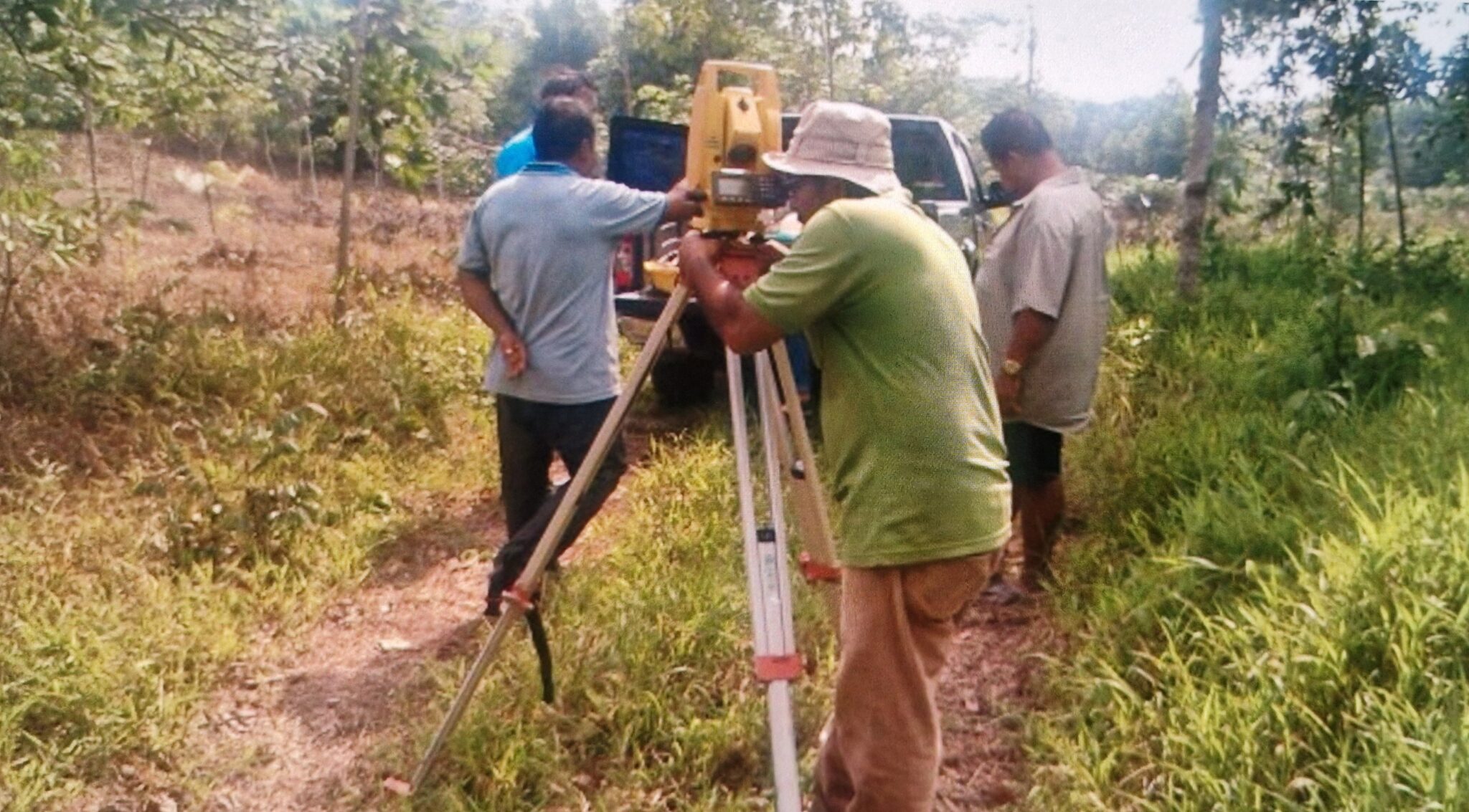 Dus die eerste aanbetaling toch gedaan en inmiddels is uitgemeten waar ons huis komt te staan. Helemaal verrast werden we door de aannemer, hop van de ene op de andere dag, houtjes en touwtjes, meetmannetjes, surprise. Zoals eerder geschreven laten we een huis op palen bouwen: rechtsvoor wordt de paalhoogte vijftig cm, linksachter bijna twee meter. Vanaf gepaste hoogte uitkijkend over de Thaise landerijen. Lubbelees! ( vertaal: rubbertrees, die ‘r’ blijft een Aziatisch plobleem). We genieten heel even van dit hoogtepuntje want de volgende problemen, oh nee uitdagingen, kondigen zich al aan. Na de waterput nu: wat te doen met de Electic City, oftewel de elektriciteit