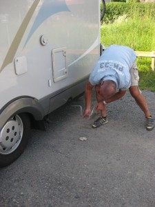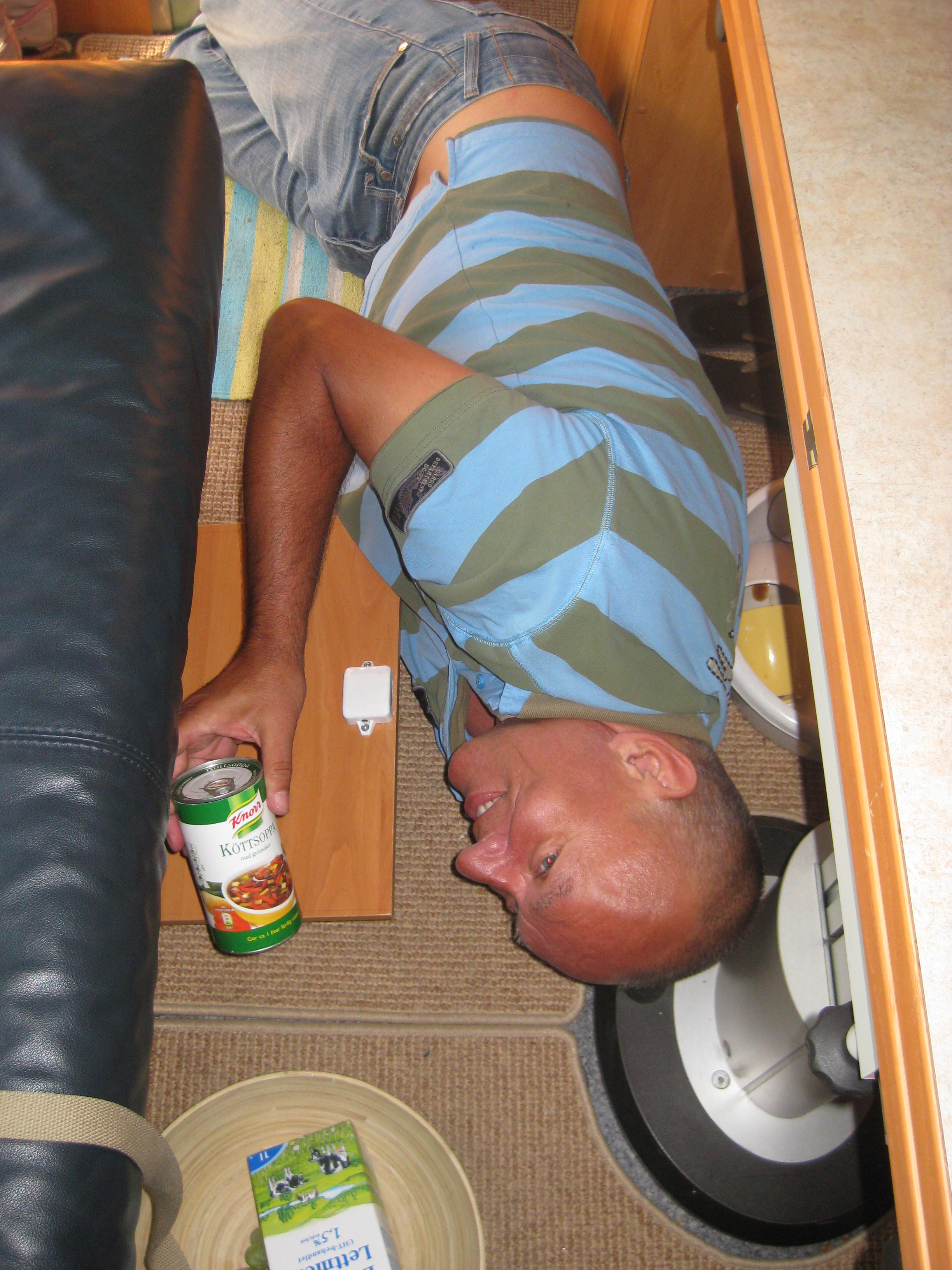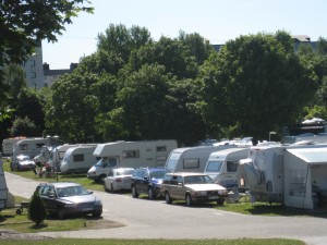 Osby, aan een klein meertje, langzaam richting Stockholm trekkend. Hij is de hele dag druk met technische snufjes, oh, doet de espresso het op 10 ampère, waar is de Kreeftskering, hoe reken ik de GPS coördinaten anders om, sluiten de kastjes goed, werkt de gasaansluiting voor buiten, waar kunnen we alles lozen etc. Zij: wat doen de prijzen hier, wat kost hier een appel, kaas, melk etc, wanneer/waar zullen we wassen, hoe deel ik die camper wat praktischer in, wat zal ik vandaag koken (net thuis toch?), maar ook waar haal ik mijn internet!!