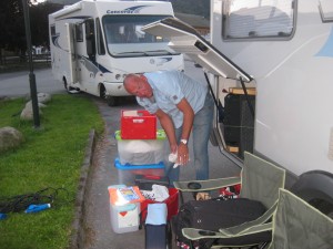 De zon gaat onder in het meer, Nederland voetbalt tegen Kameroen, maar is al zeker van een plaats, Herman laadt de camper in, ik zit achter de laptop, wat is het leven toch heerlijk!!