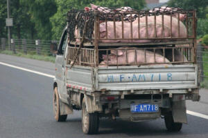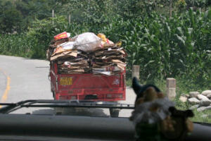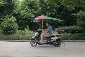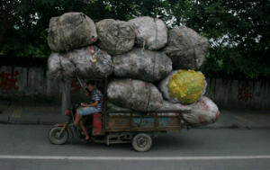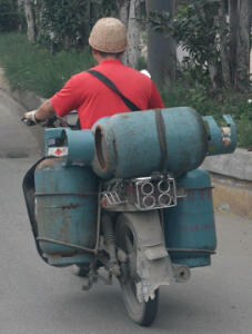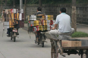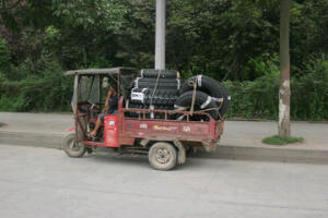 Vandaag rustdag (lees shopdag) voor mij en grote Boeddhadag voor Herman. Wat heerlijk om eindelijk eens zonder tijdsdruk te kunnen winkelen! Met een paar andere in een riksja, met brommertje ervoor, naar de Walmart. De rit voor Herman naar de Boeddha duurde met de bus 3 uur heen en ook weer 3 uur terug, dat hield mij een beetje tegen. De rit in de riksja duurde 15 minuten heen en evenzoveel terug. Das dan ook lang genoeg om je beklemd te voelen zitten tussen vrachtwagens, bussen, andere riksja’s, auto’s, fietsen en scooters. Mn de kruisingen zijn spectaculair, je hebt dan t gevoel dat er van 4 zijden bij je binnengereden wordt! Het ritje naar huis, 5 uur later, was verwennerij. Met boodschappen en al voor je camper afgezet worden, hm ik zou er aan kunnen wennen! Het was de 10 yuan ( ongeveer 1 euro) dik waard! Hierbij een indruk van alle grappige vervoersmiddelen in China!
