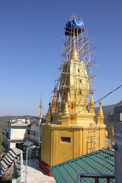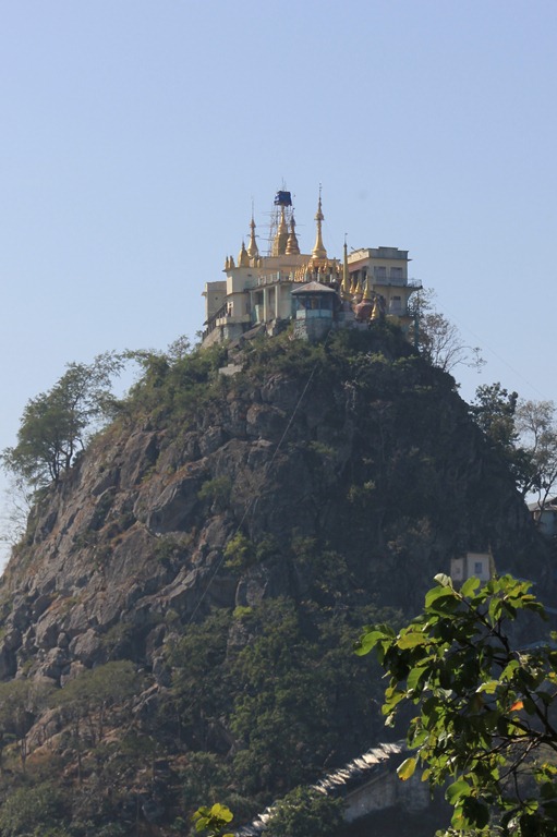Vandaag hadden we een dagje vrij en vanzelfsprekend werd dit weer ingevuld met een attractie, nu Mount Popa. Gister hadden we ons om laten praten door onze gids om in een gezamenlijk gedeelde taxi met andere toeristen hier naar toe te gaan, in het kader van, we zijn er nu toch, en onze dagen zitten nog niet vol genoeg! We hadden het kunnen raden voor 10 euro pp 60 km. heen, 60 km., terug inclusief sightseeing zit er een addertje onder het gras! En jawel, van de lokale palmoliemaker, naar de alcoholstokerij, naar de fluitjesvouwer, naar de pindabrander om dan uiteindelijk toch bij Mount Po(e)pa uit te komen. Hier moeten we een enorme trappenpartij overwinnen met overal rondspringende apen en souvenierstentjes om boven te komen. In Birma, zoals in vele Aziatische landen, is het de gewoonte om de schoenen uit te trekken in een heiligdom. Echter het heiligdom begint vaak al op tijd, en de grond is nu niet overal even schoon. De onderkant van onze voeten blijft niets bespaard! Afin we springen om de apenpoep en de donationvragende trappenpoetsers heen en klauteren over roestige treden langzaam omhoog, poeh poeh! Mount Po(e)pa, is een vulkaan waarop een klooster is gebouwd. Hier worden de ‘nats’ de geesten vereerd. Birmezen zouden hiernaar toe komen om deze geesten te eren, en zo ook het onheil te weren. We zien echter weinig Birmezen, en ook Mount Popa blijkt under construction.