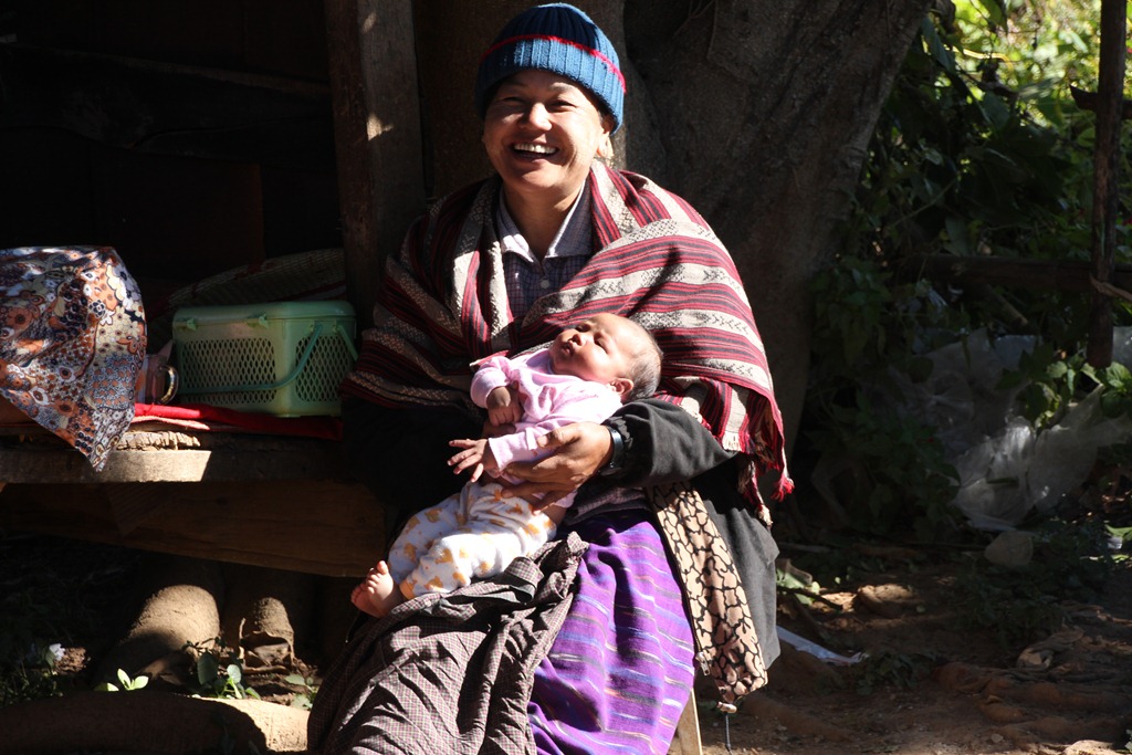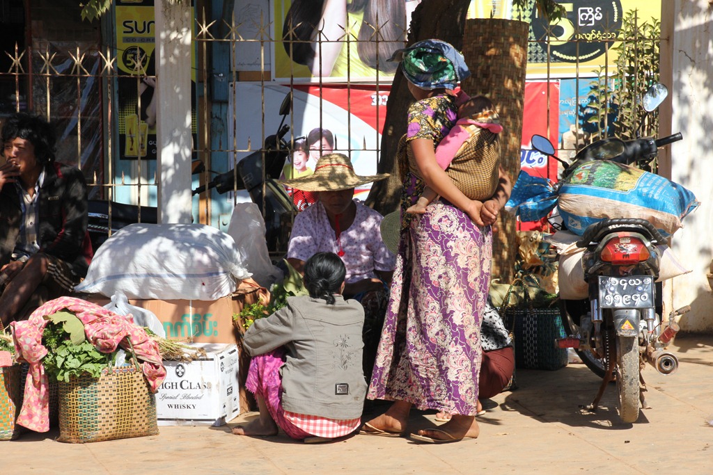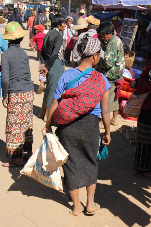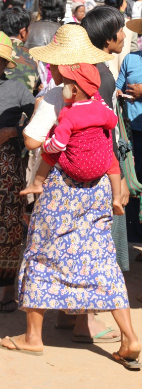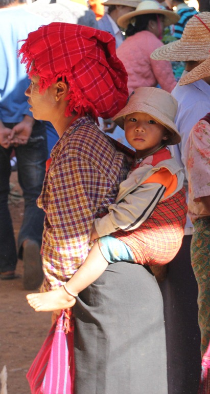 De traditionele dracht van de Pa-O, de 2e grootste tribe hier na de Shan is zwarte kleding met een kleurige hoofddoek. Zoals de eerste mama op de foto.