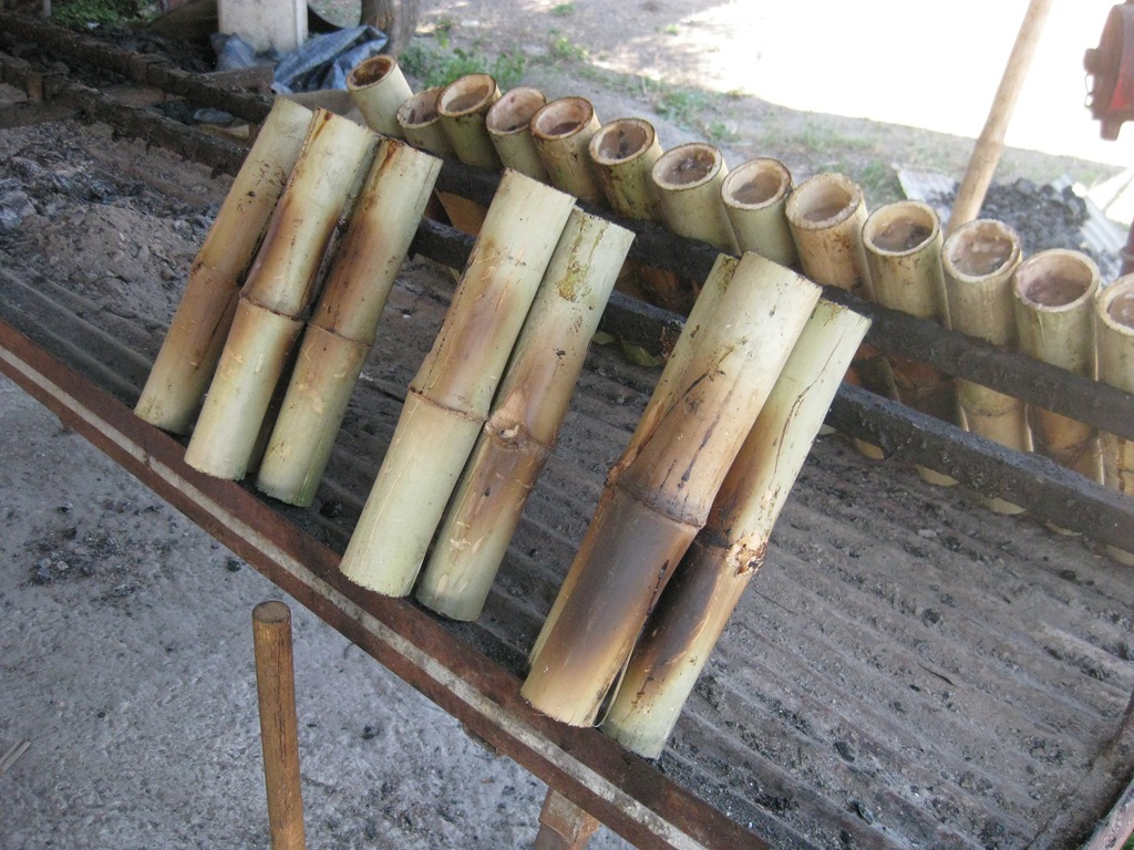 Nu nog naar de trein, oh daar hebben ze die lekkere boomstammetjes met rijst en cocos! Het stammetje wordt door midden gehakt, en we hebben ons toetje binnen.