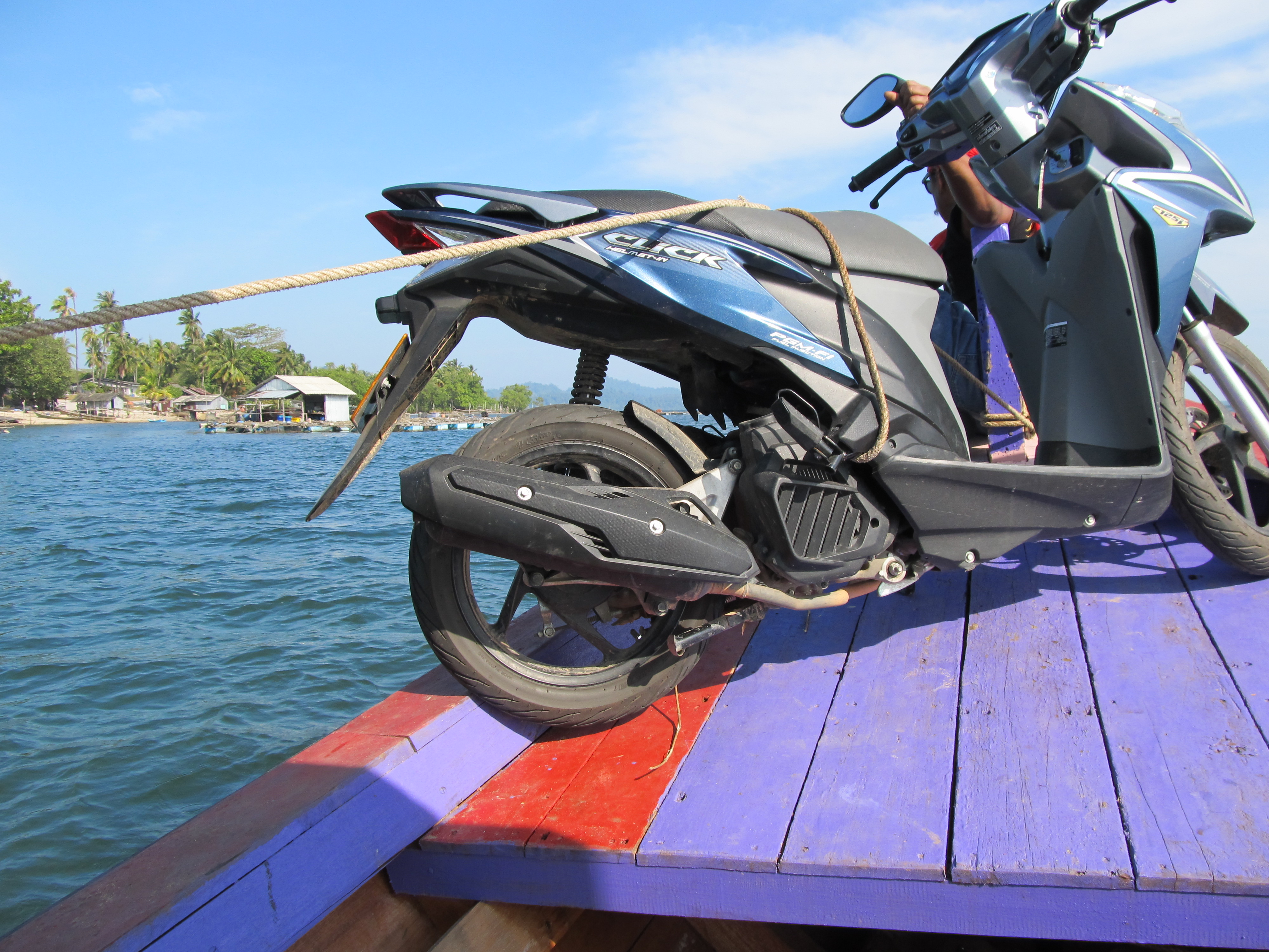 Het eiland is alleen te bereiken met een longtailboot, het ritje duurt een uur. We genieten bij de pier aan het vaste land van de mooie vissersboten om ons heen, en de vissers genieten van ons! Overal snookertafels, drank, sigaretten, en hardrock muziek ’s morgens om 10 uur, de vissers hebben hun lading gelost!