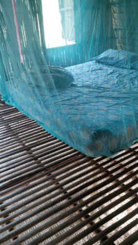 We hebben redelijk geslapen, hadden alleen een 15 cm doorsnee kakkerlak aan de verkeerde kant van het muskietennet, Aaarghhh! De kikker bijna geplet onder onze voeten, en de huismuis geschrokken van m’n gegil!