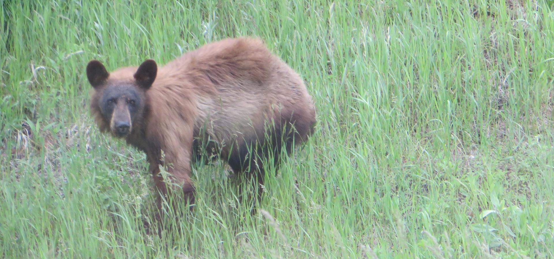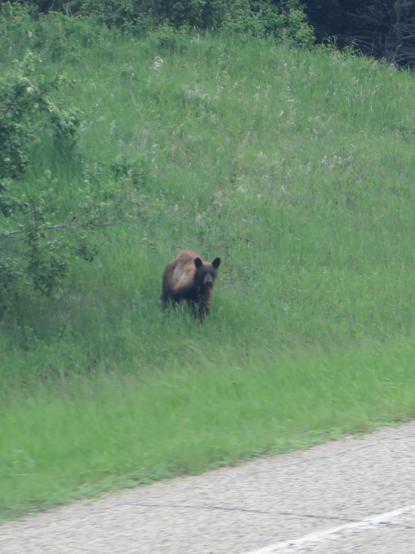 Ja!!! Daar is ie dan, en we noemen hem Bolke!Meer dan 5000 kilometer verder, op de dag dat Nederland Chili verslaat, rijden we het nationale park, Riding Mountain in, en in een keer, onze eerste beer!! Stoer! Hij is wel wat bang, we maken ( vanuit de camper!) snel een foto en rijden langzaam door, achter ons sprint hij weer als een razende terug de weg over. Wij denken dat hij een zij is en dat er kleintjes zijn aan de overkant. Daarom ook zo schichtig.