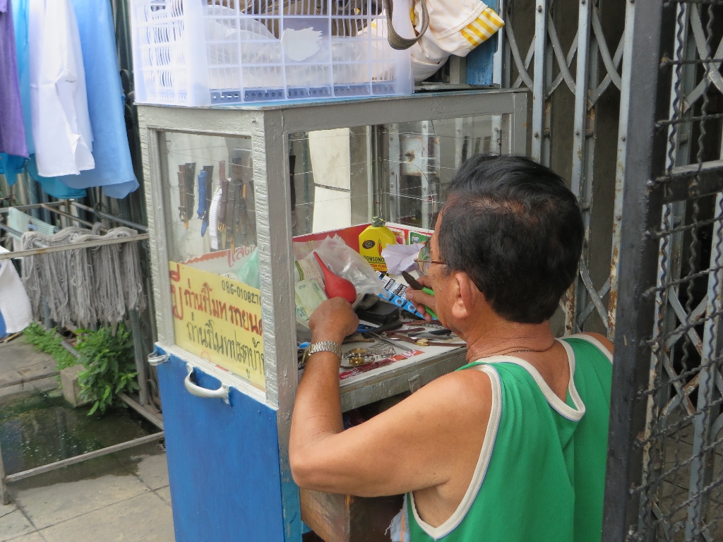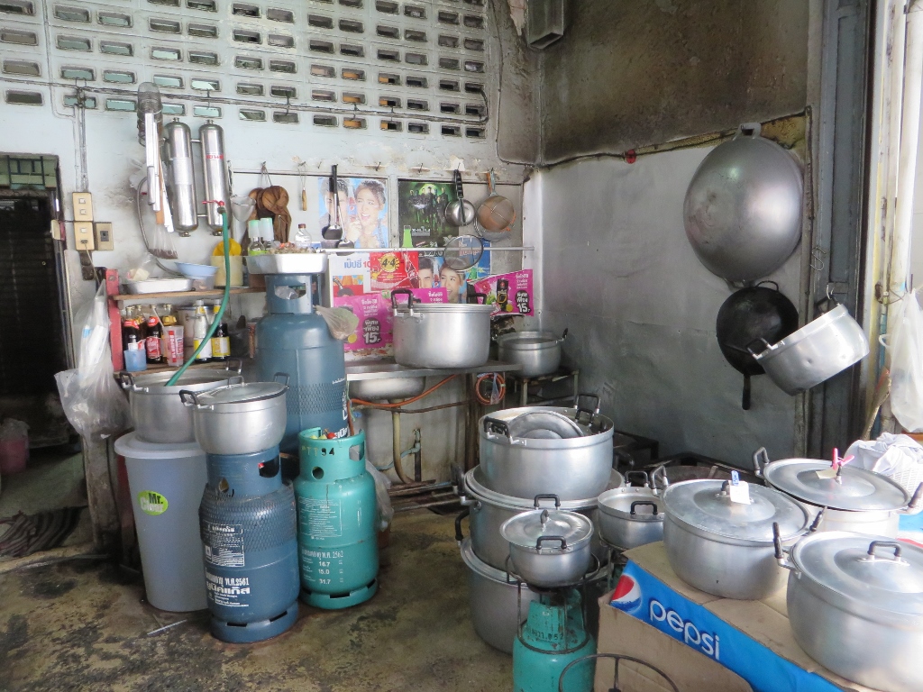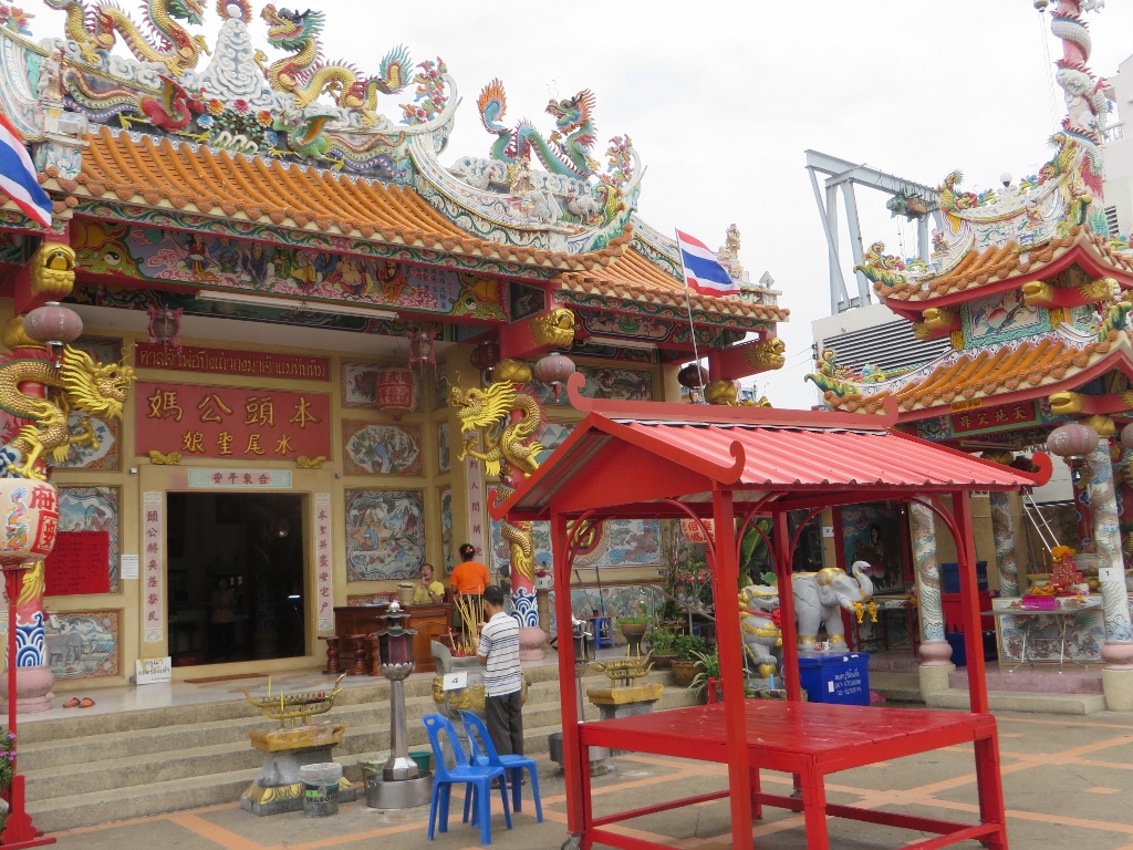 Met de skytrain en de boot arriveer je na 2 uur en vele verdrukkingen later in Nonthaburi. Een noordelijke (ik hoop dat ik het goed zeg met mijn vrouwelijke route-gen) wijk in Bangkok. Nog wat authentieker is het hier, wat minder stads. Wat je dan minder noemt, want druk is het er net zo goed. Overal marktkraampjes en eettentjes, de boel wordt opgepoetst, stoeltjes klaargezet, de Chinese tempel blinkt want morgen is het de verjaardag van de koning.