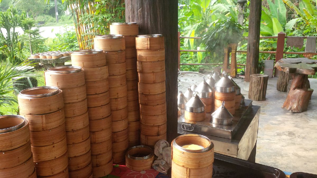Dochterlief zorgt er vandaag voor dat ze gestoomd worden. De mama zet een potje jasmijnthee, en een schaaltje rauwkost neer, en mixt daarnaast nog allerlei zoete roze drankjes van kokosmelk met een soort ranja, voor de thaise kindjes die een tafel verderop zitten. Yoghidrink!