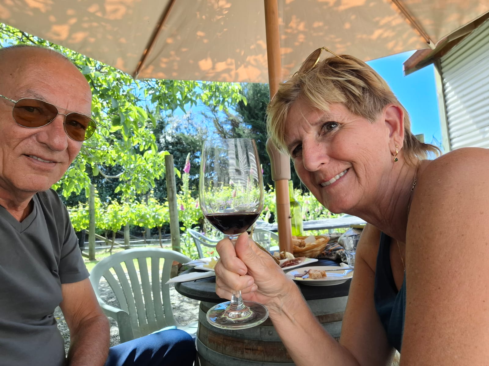 We parkeren onze slaapplek, die we hard nodig hebben, en gaan aan de proeverij en een kleine tour. Klein omdat het een hele kleine wijnmakerij is, man en vrouw, en 2 dochters die af en toe bij ( moeten 😅) springen. We worden goed verwend, verwijnd 🍷🍷